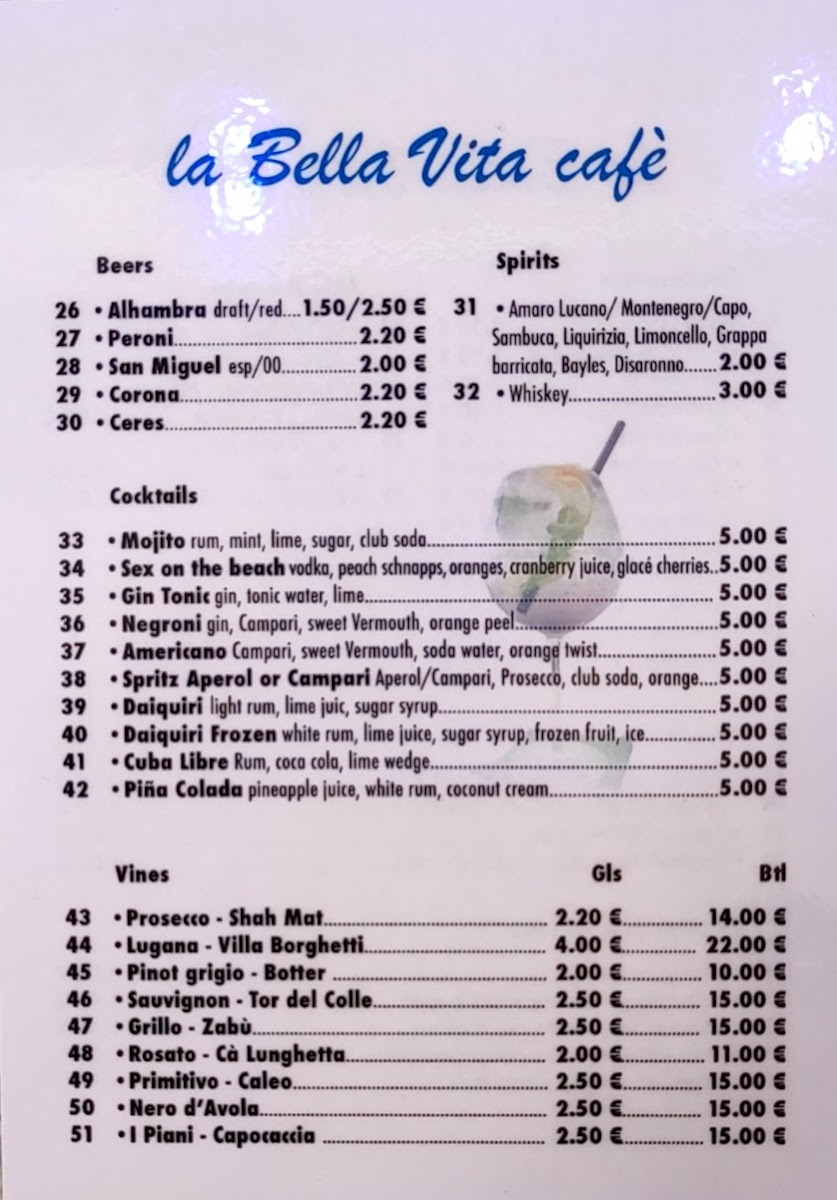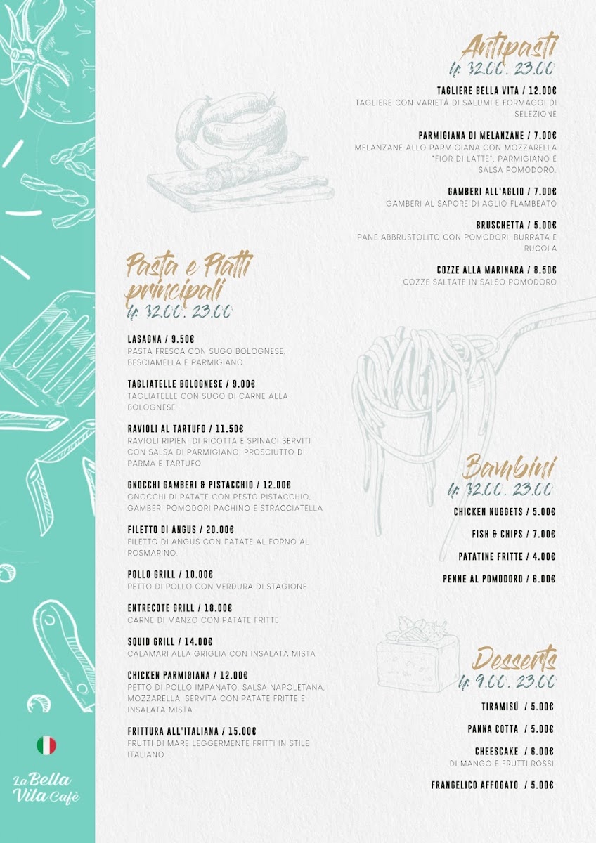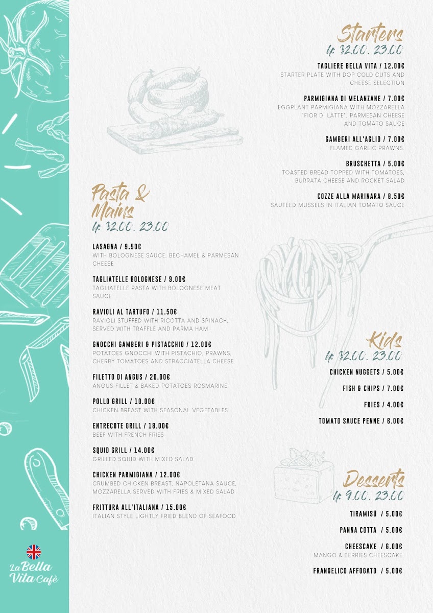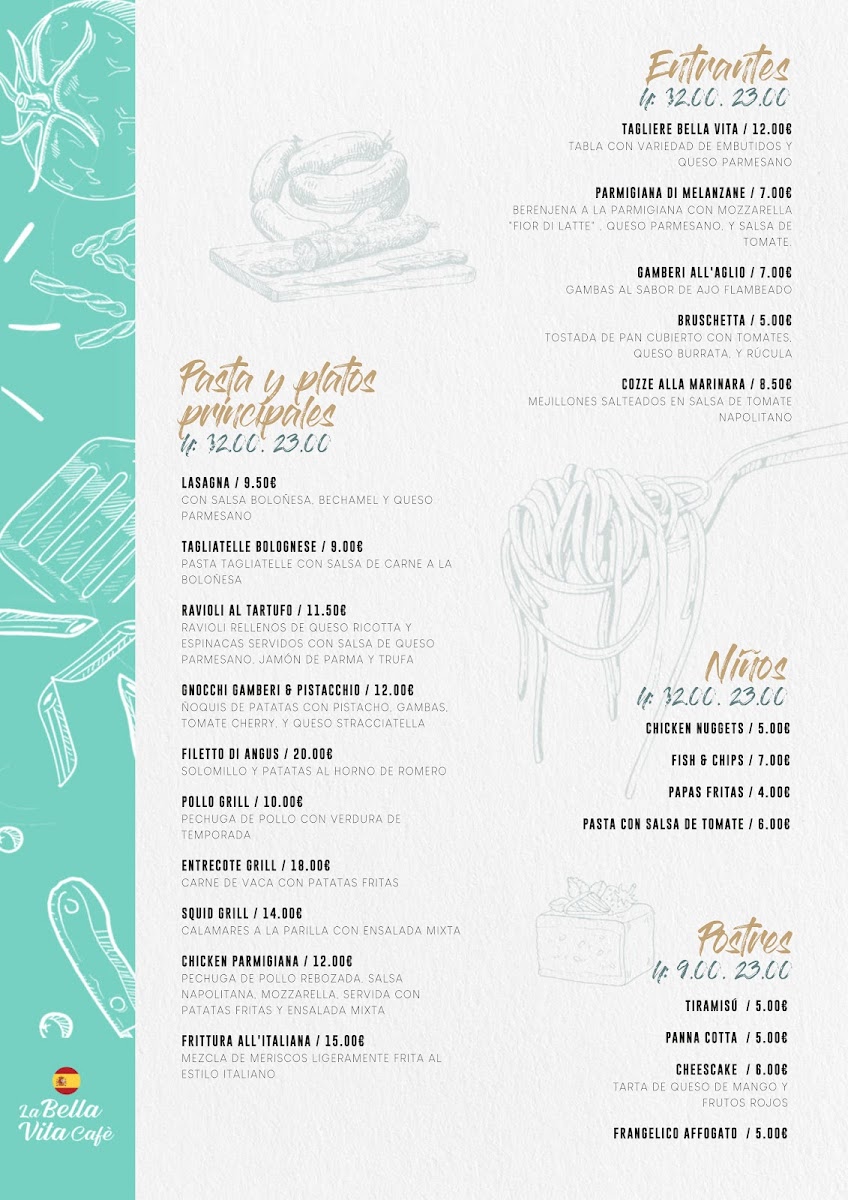 For the younger guests, La Bella Vita Café's Menú Infantil offers a range of colorful dishes that are not only delicious but also fun! From crispy, golden Patatas Fritas and delectable Nuggets De Pollo to comforting Pasta Con Salsa De Tomate, priced between €5 to €6, there’s something to delight every child’s taste.